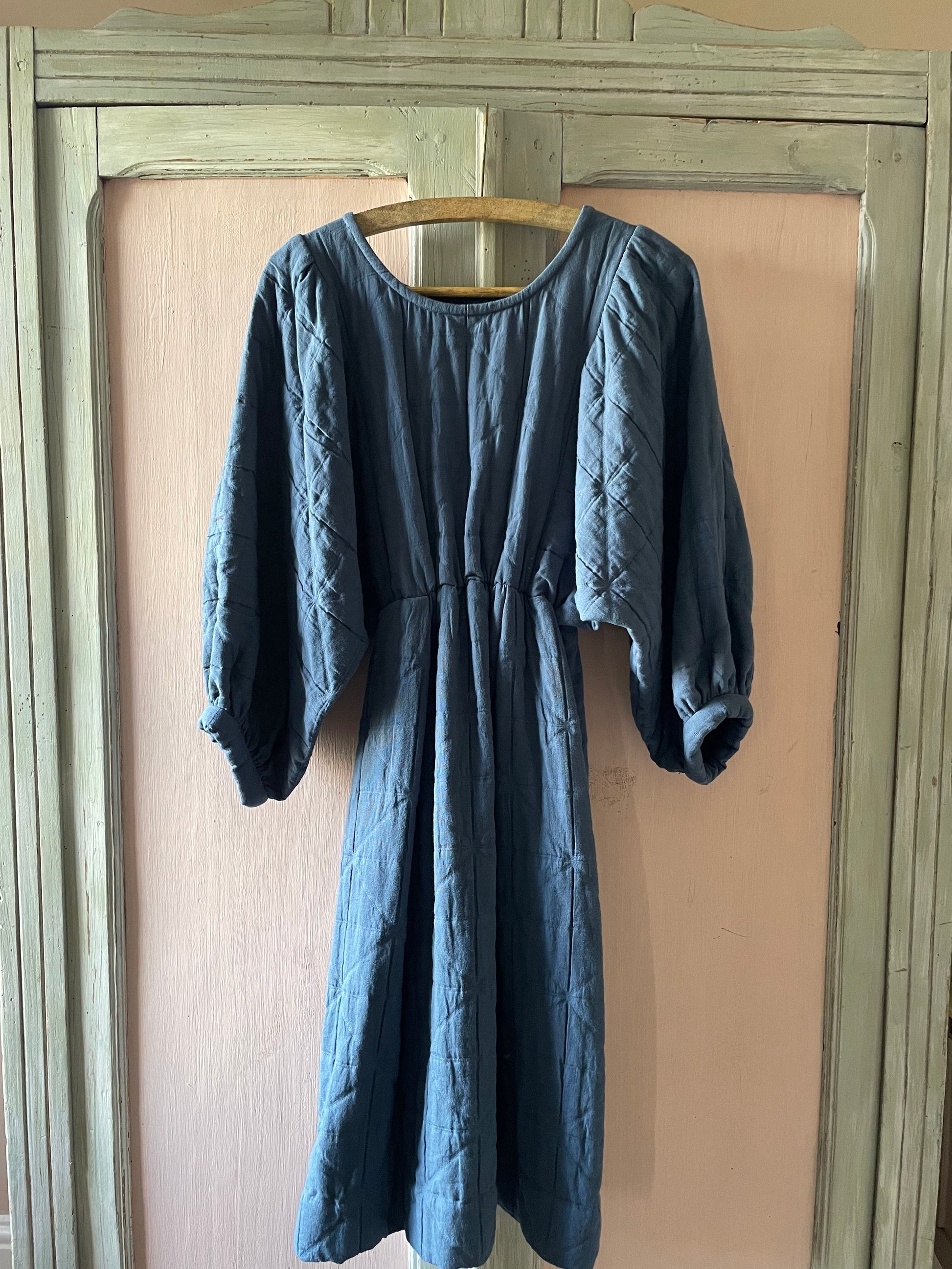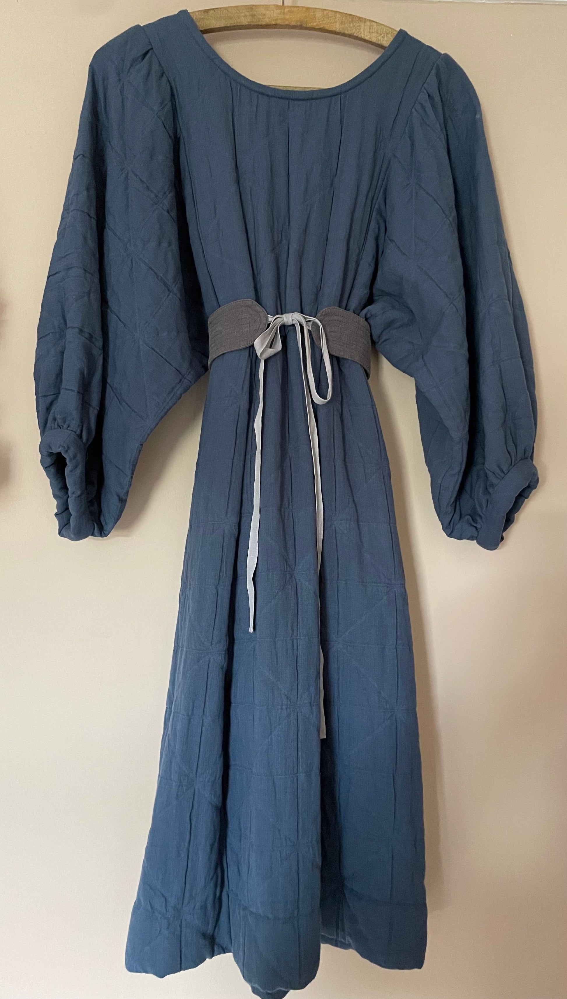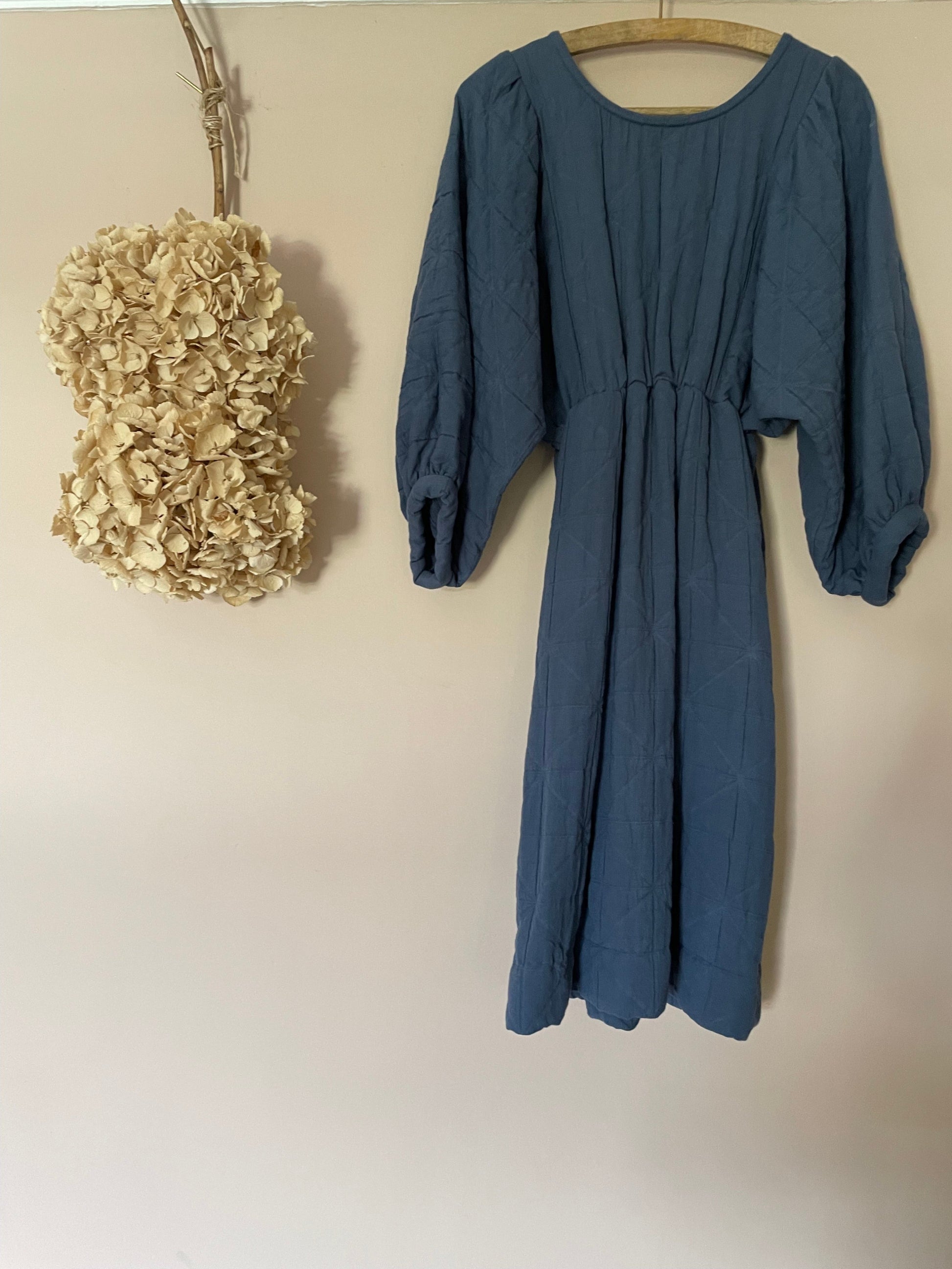 Cotton quilted jacquard dress in blue. Gathered sleeves and elastic at waist. Can be worn with belt sold separately.